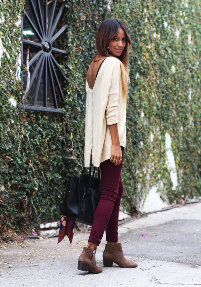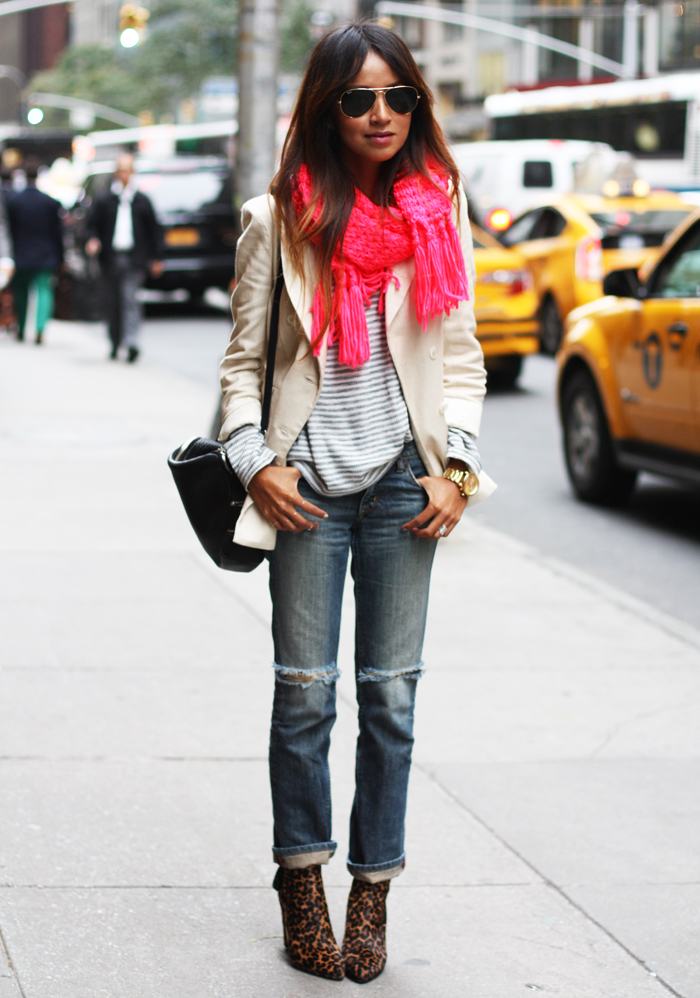 | Pretty neutrals for fall paired with cool distressed boyfriend jeans! |