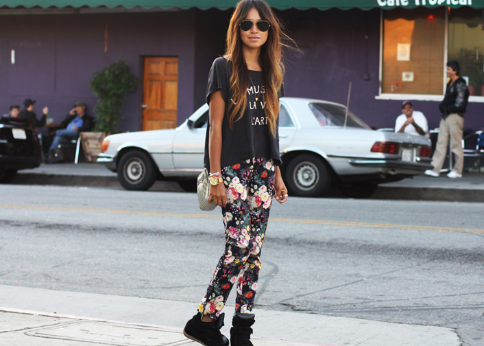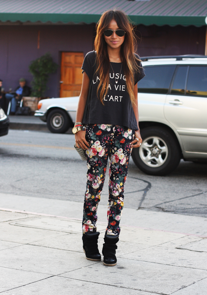 Pants: Mango (similar here, here + here) | Tee: f21 | Sneakers: Isabel Marant | Bag: Vintage Gucci (tote here) | Shades: Ray Ban | Necklaces: Alexa Leigh |