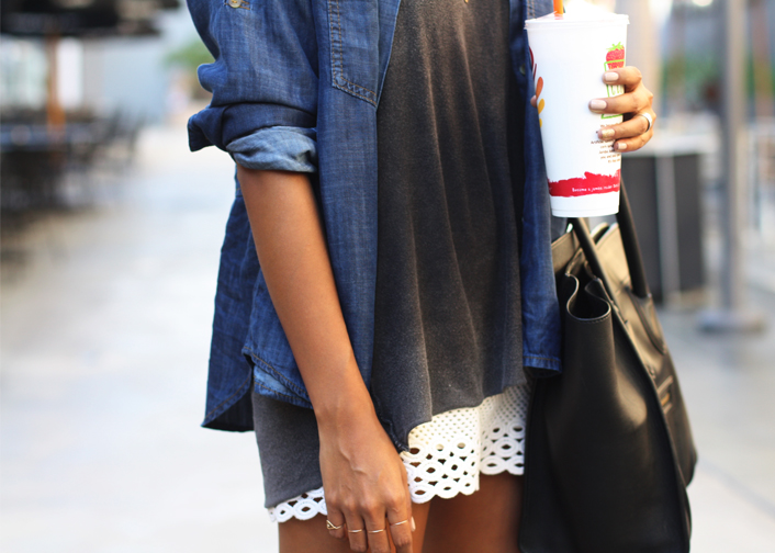 Denim shirt: Bella Dahl | Tee: Brandy Melville (worn inside out) | Skirt: Random | Bag: Celine | Necklaces: Gabriela Artigas and Alexa Leigh