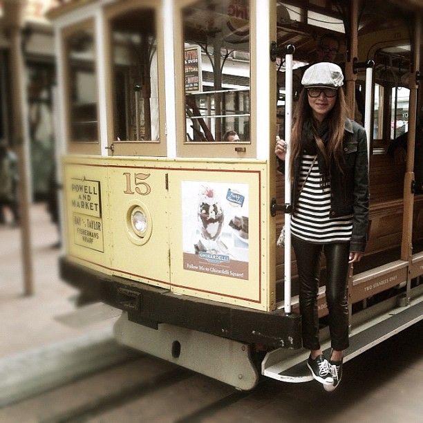 | Trolley ride down Powell Street in SF; wearing Vintage blouse, Levi's jacket, Tripp leather skinnies, leather converse and warby parker glasses. |
