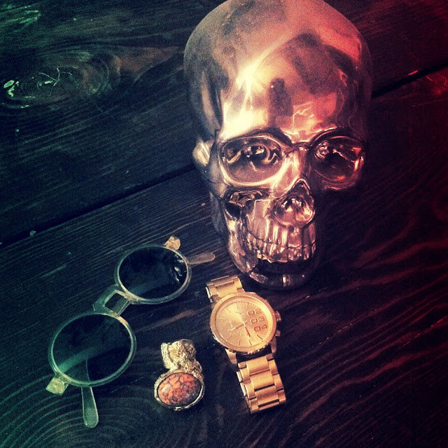 | My girl D$'s cool things, minus the watch. (vintage sunies, YSL ring and cool skull) |