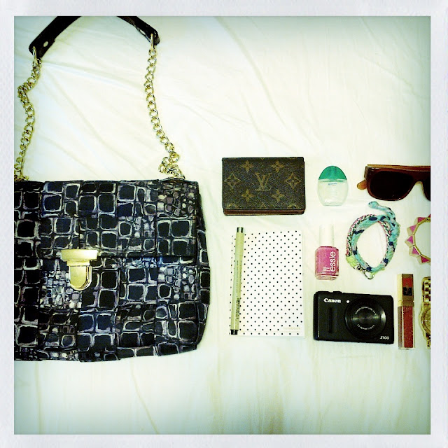 | Some essentials: LV card wallet, eye drops, 3.1 Phillip Lim shades, friendship bracelets (Gap + JCrew) , Essie polish, YSL lip gloss, Diesel watch and Canon Powershot s100 |