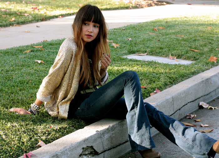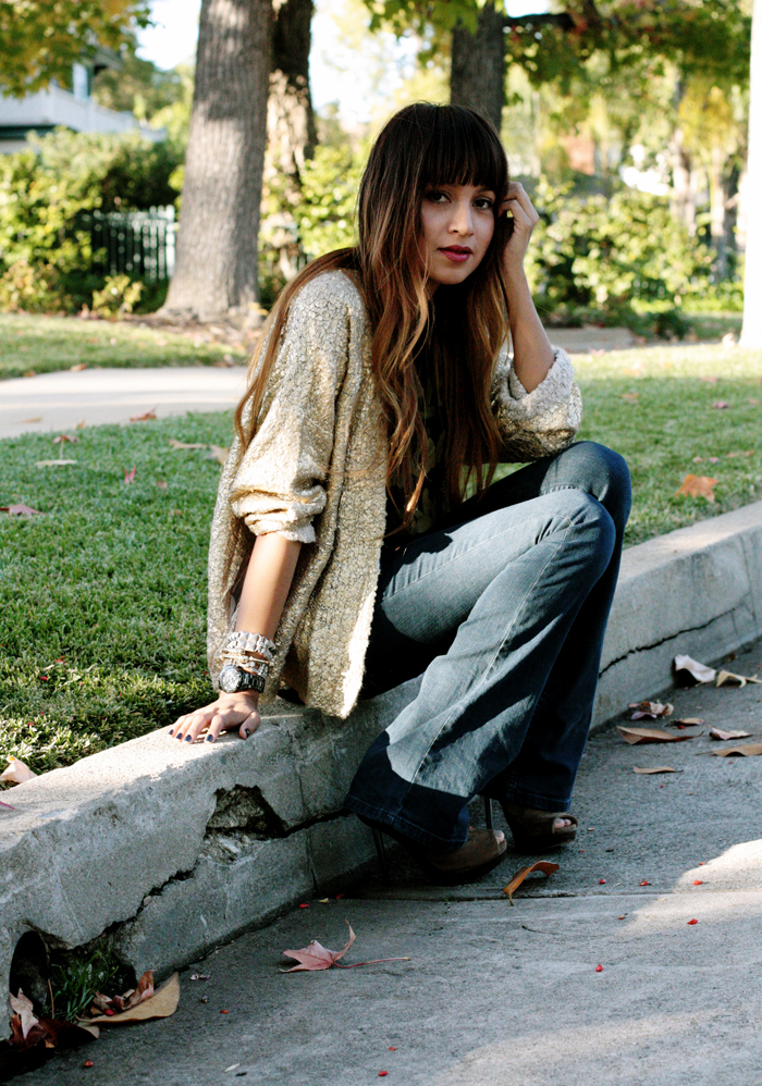 Gold sweater: H&M | Tee: UO | Jeans: Free People | Heels: BCBG | Watch: c/o Fossil | Shades: Ray Ban Large aviators