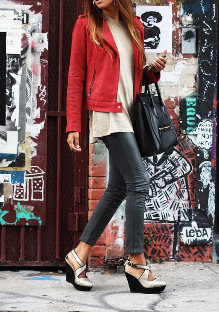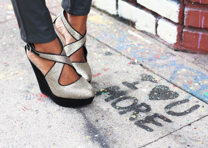 Gimme a leather motor jacket, some leather skinnies and some pretty sparkly wedges and I'll be the happiest girl, ever. This look came together in five minutes, literally- (love when that happens!).