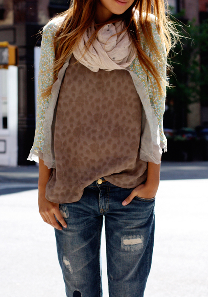 | Pretty neutrals for fall paired with cool distressed boyfriend jeans! |