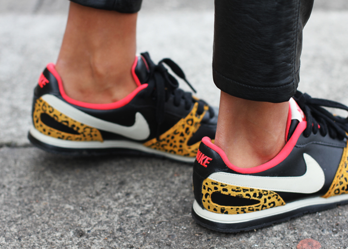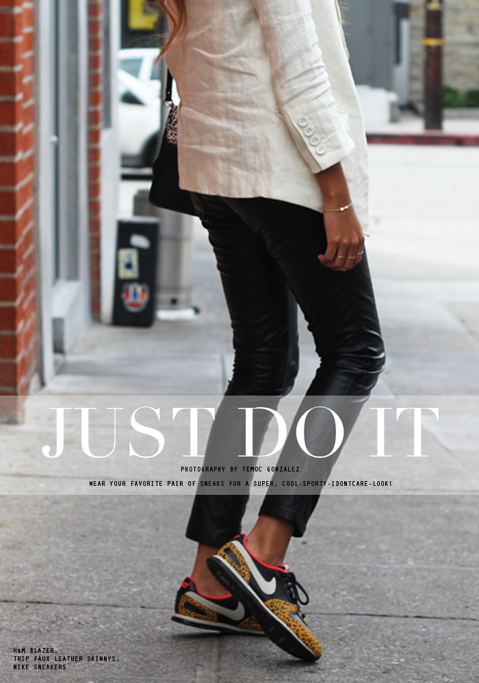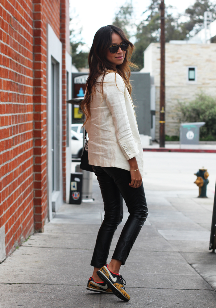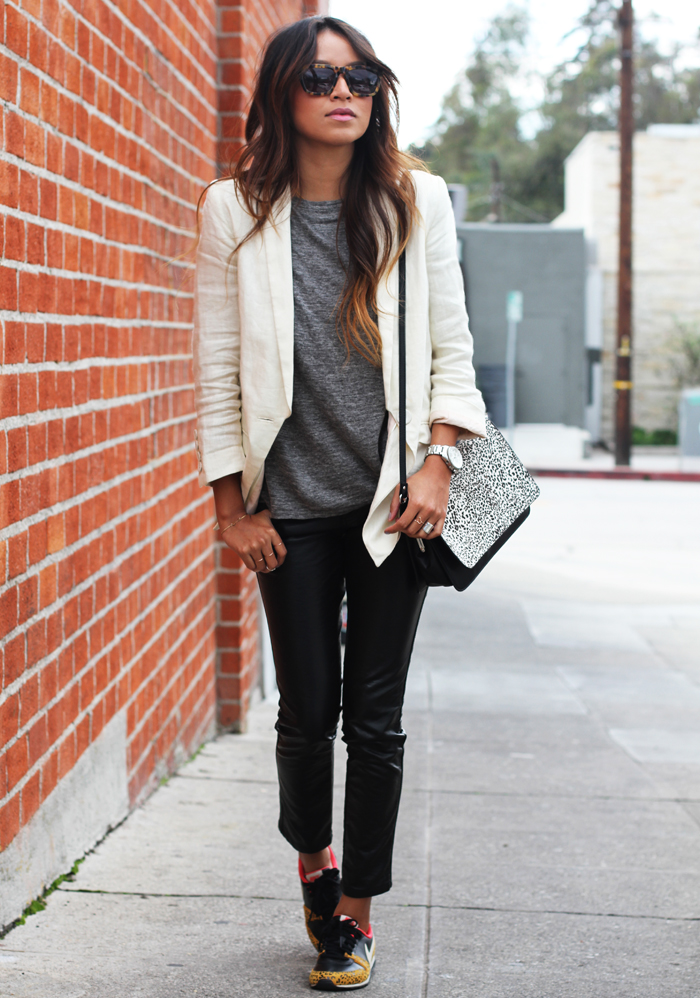 Blazer: H&M (similar here ) | Tee: Zara | Faux leather skinnys: Tripp NYC (similar here, here + here) | Sneakers: Nike | Bag: Zara | Shades: Karen Walker | Heart ring: Ariel Gordon |