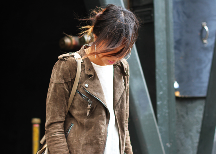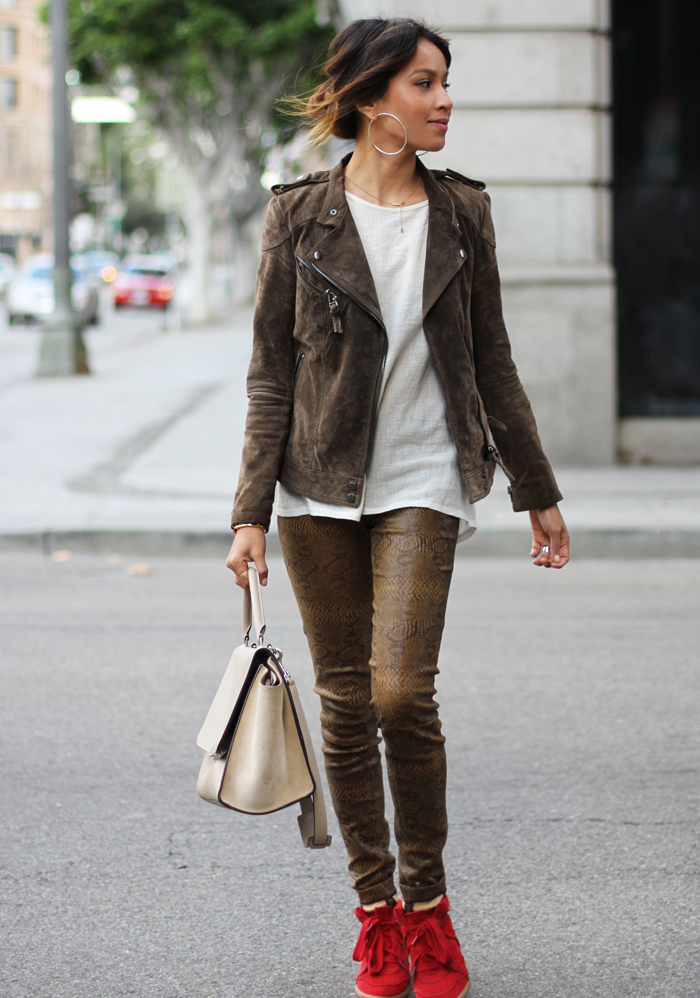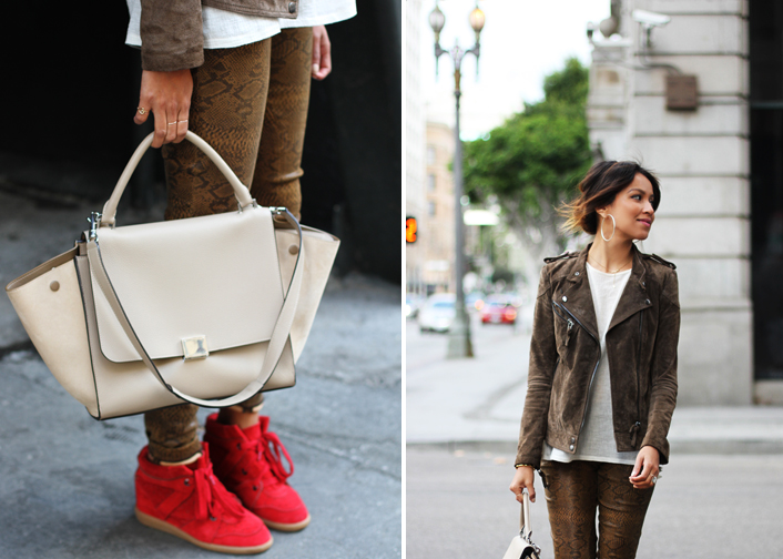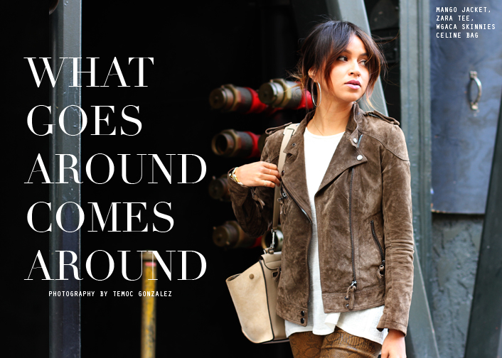 $ 0 0 Skinnies: What Goes Around Comes Around | Leather jacket: Mango | Tee: Zara | Sneakers:Isabel Marant | Bag: Celine