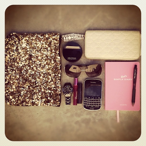 (fave vintage bracelet, Comme des Garcons wallet, makeup forever powder, MJ sunnies, Fossil watch, Givenchy mini perfume, Laura Mercier lipbalm, Blackberry Bold, Keel's Simple Diary)