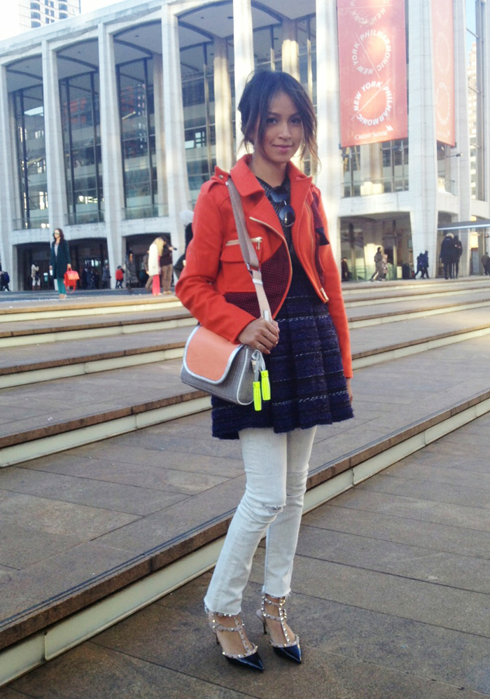 Second day of fashion week and the weather cleared up a little, allowing me to walk around in more "fashion week appropriate" shoes other than my sneakers. This dress over jeans ensemble is a little funkier than my usual but it's fashion week, so anything goes... besides, Herve Leger's show on Saturday had this sorta styling going on the runway too. (dress over pants/leggings)