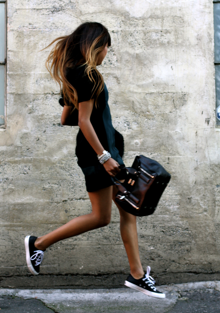 $ 0 0 Dress: French Connection | Coat: Vince. | Bag: 3.1 Phillip Lim | Sneakers: Sparkly Converse New sneakers always make me jump for joy!xo