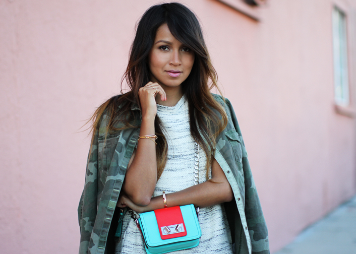 | Almost all-white look to bring in the Spring! Topped it off with a pop of red and teal for a fun, fresh look! The camo adds a tough look. All about that balance! |
