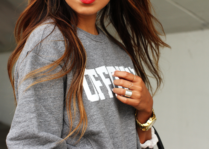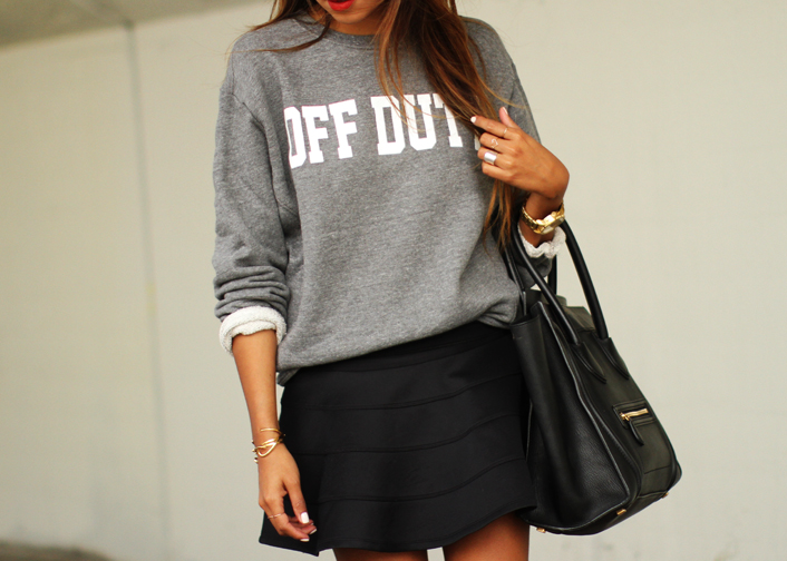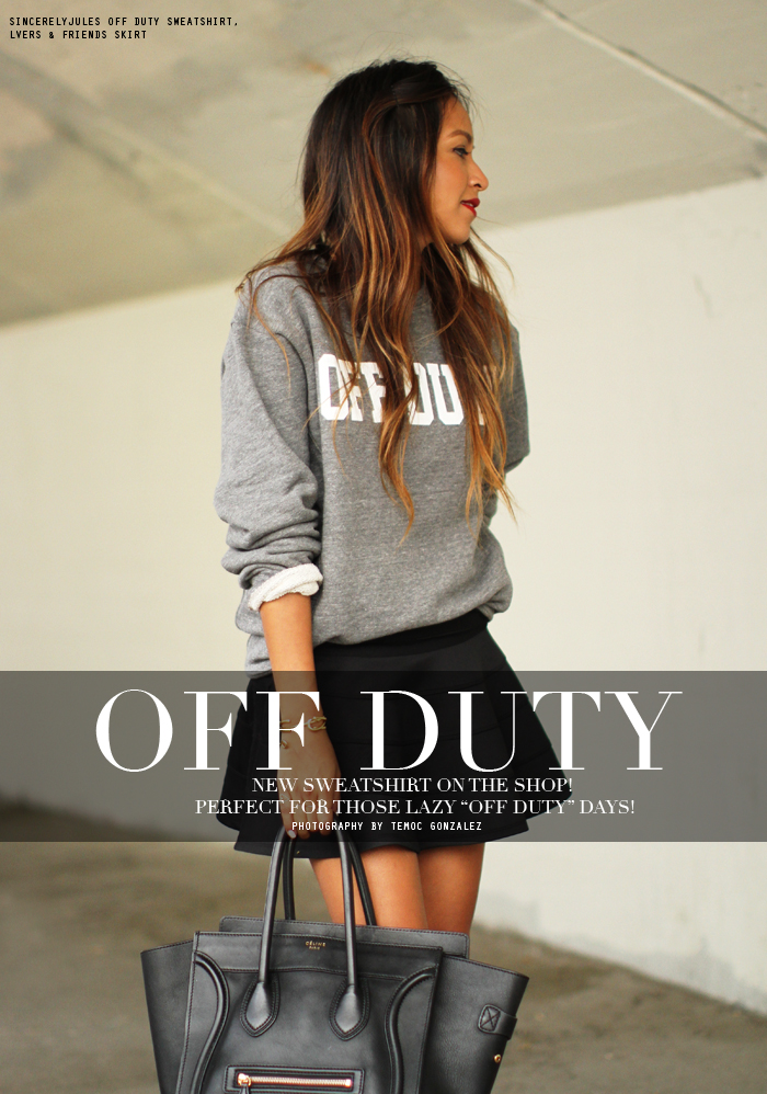 | Finally! New designs up on my shop! I'm so excited to introduce this off duty sweatshirt because it fits my life so perfectly. It's beyond comfy and looks pretty cool when paired with skinnys and strappy heels or in my case, a skirt and rad studded flats. The off duty saying is perfect for those lazy days where you really don't want to try hard to put something good together, this sweatshirt does the trick for you! SHOP it HERE! xo |