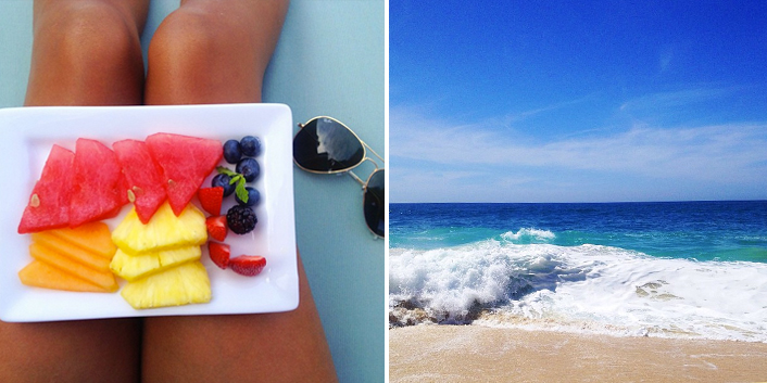 | (L): Our gorgeous villa had our own butler and chef, so we would always start off with morning fruit! (R): The different shades of blue were mesmerizing... the waves were pretty intense too! |
