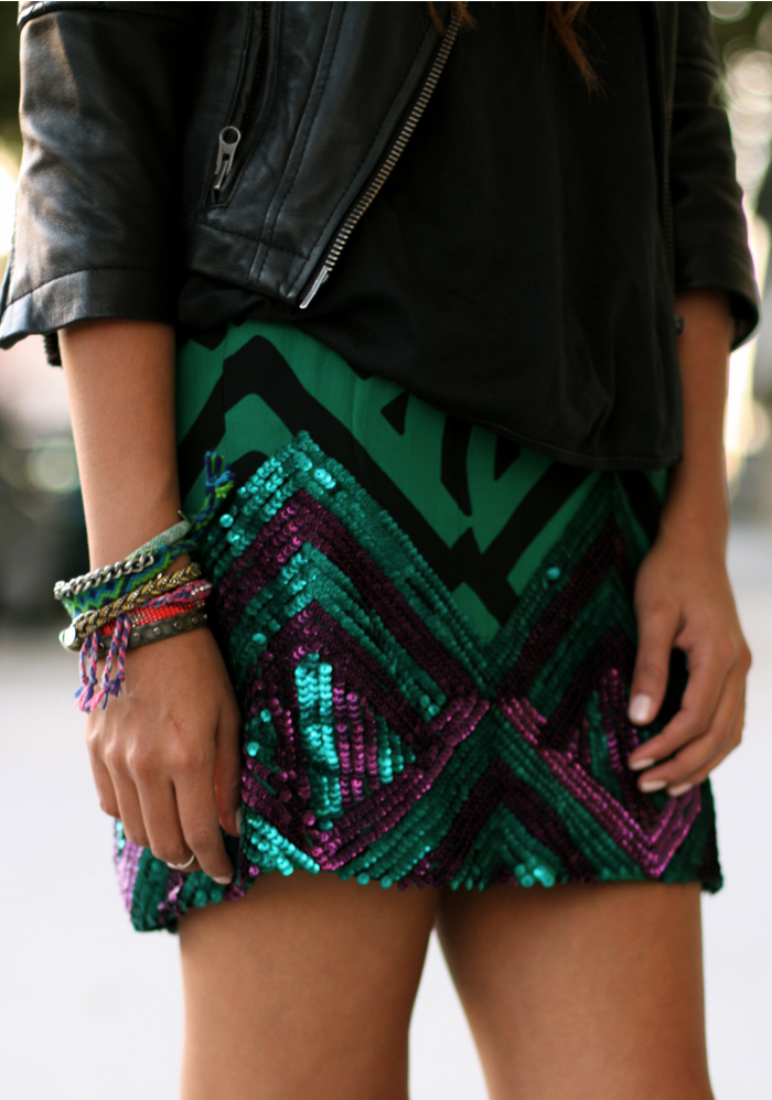 Leather jacket: ASOS ( cool ones here & here) | Tank: Helmut Lang | Skirt: Anthropologie | Beanie: Zara | Sneakers: Converse | Friendship bracelets: here, here & here.